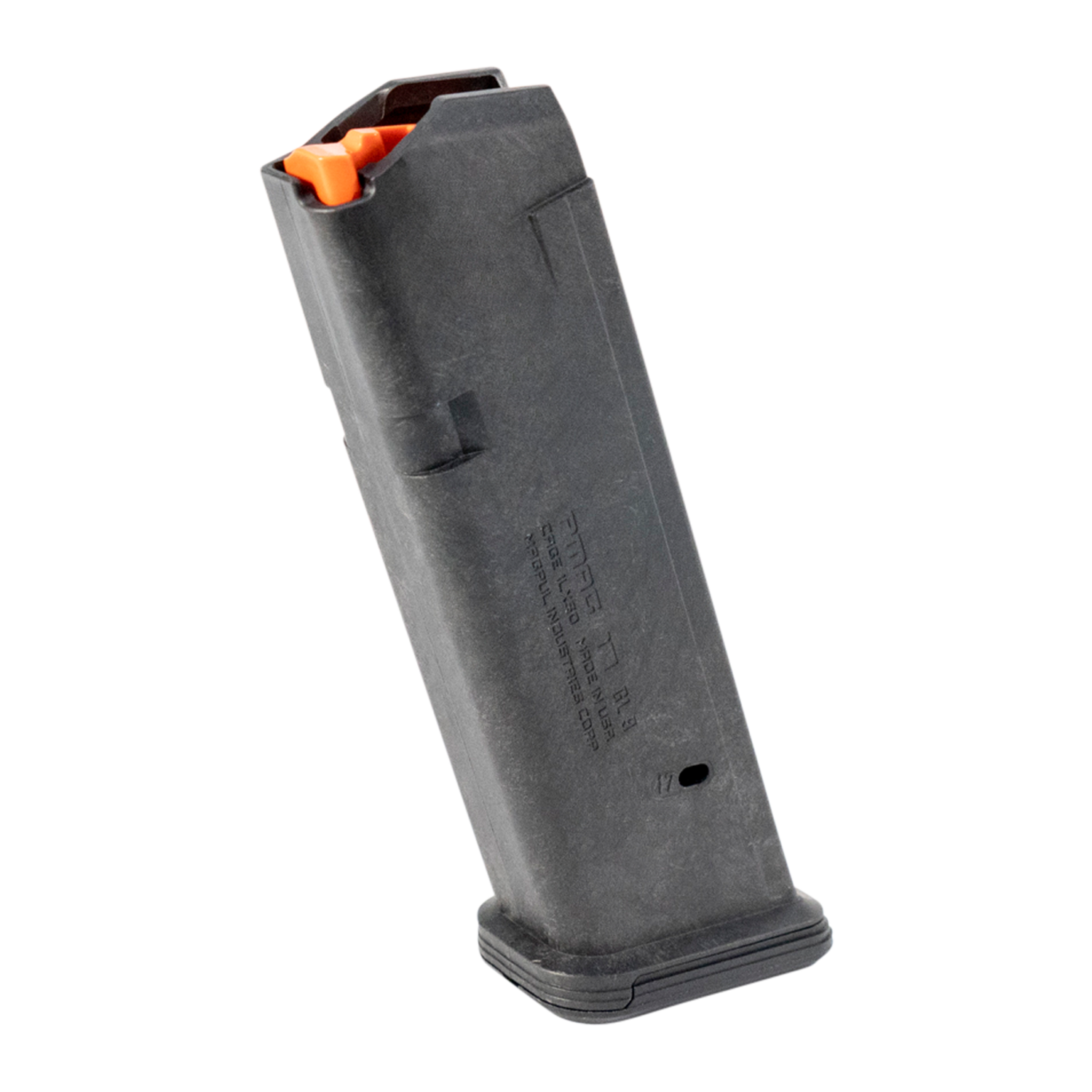 The PMAG 17 GL9 is a 17-round Glock 9mm handgun magazine featuring an all-polymer construction for great durability over thousands of rounds. It includes a high visibility controlled-tilt follower, a stainless steel spring, an easily removable floorplate for cleaning, paint pen dot matrix for mag marking, ridged floorplate edges for better grip, and 17-round indicator windows.